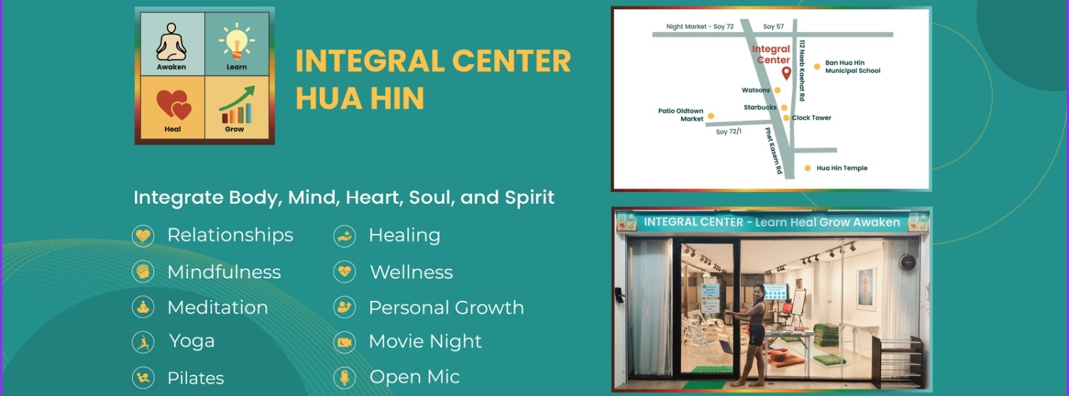 5:30 to 6:30 pm (17:30 to 18:30) Yoga Class (level of difficulty and style based on participants' ability. All levels are welcome. 300 Baht Individuals, 500 Baht Couples 112 Naeb Kaehat Rd, Hua Hin, 77110 Near the Hua Hin Clock Tower and Starbucks, across from Ban Hua Hin Municipal School Behind Watsons Google Maps Link: https://maps.app.goo.gl/NtjoXrg1HxgEsNXh7 094 393 3302 info@integralcenters.com