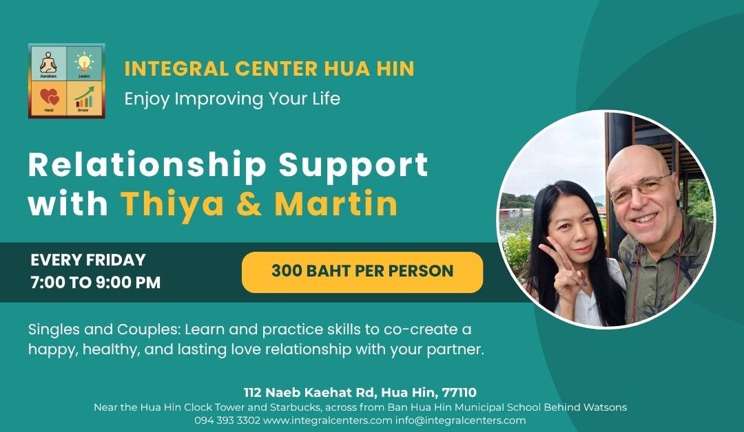 Join matchmaker Thiya and world-renowned Integral Relationship author and teacher Martin Ucik (see www.integralrelationship.com) every Monday for their weekly relationship support group for singles and couples.
