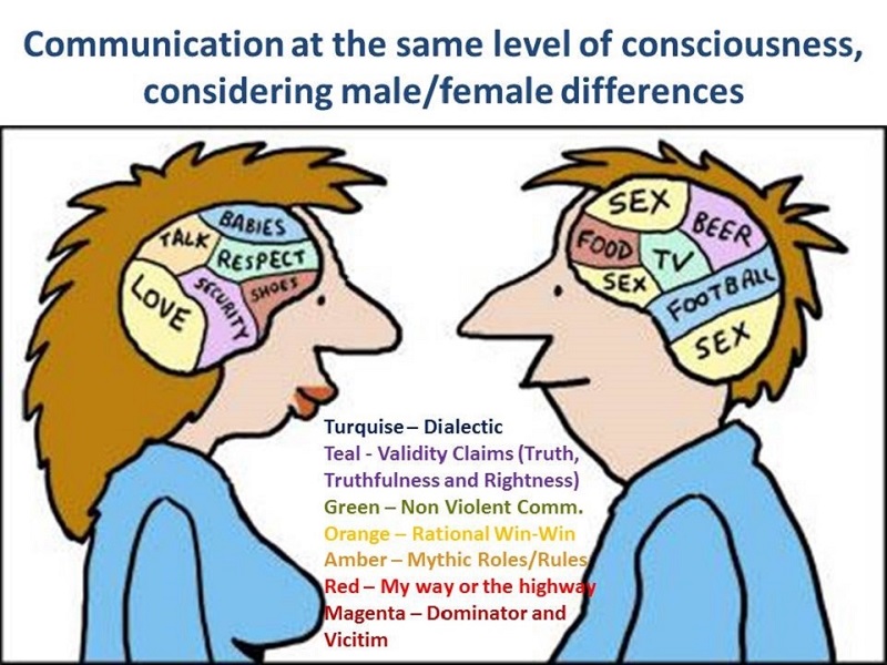 The first suggestion is to begin the conversation by being curious about what others think and feel, and to actively listen without judging, projecting, and forming answers in our head. Most people are more open to hearing you when they first feel you are listening to and understanding them. You verify this by saying; What I heard you say is… , and Are you feeling…? Second, you may want to clarify beforehand what your interests and desired outcomes for the conversation are, rather than simply stating your positions and making demands. Third, depending on what you want to express, finding the right time and place can be crucial, so again, asking can help (I would like to talk with you about … what would be a good time and place for you?) Fourth, most people are more open to hearing you if you express vulnerable feelings rather than just thoughts. This, of course, requires that you are in touch with your feelings. Finally, if you still don’t feel heard and understood, or if you are judged and rejected, your partner may be at a different level of emotional and consciousness development. Being at an Integral or higher level of consciousness allows you to either adjust your communication to your partner’s level or kindly end it, as what you say is over his or her head and there is no way he or she can understand you.